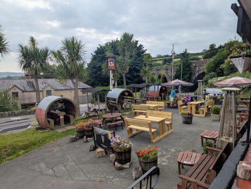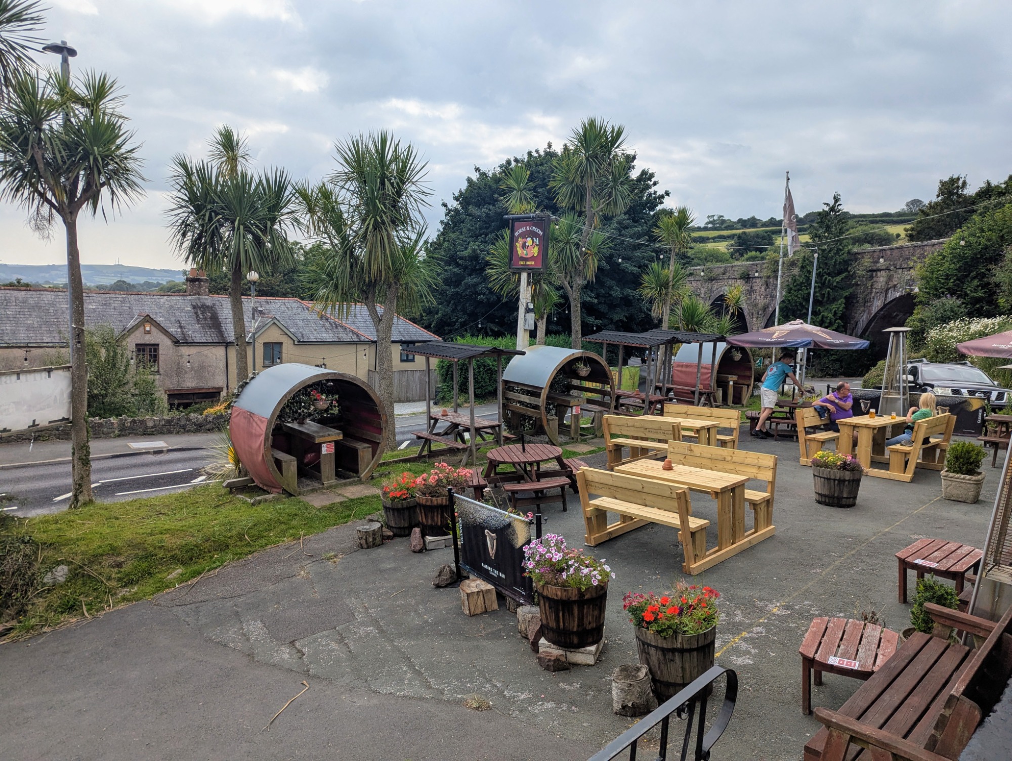 Then it was time to explore the beer garden out front. It's got these amazing palm trees and incredible views looking at the viaduct. Plus, we totally fell for their clever beer barrels that had been turned into chairs – such a cool, unique touch. It's truly a cracking spot to enjoy a pint, whether you're inside by the bar or out in that unique garden.